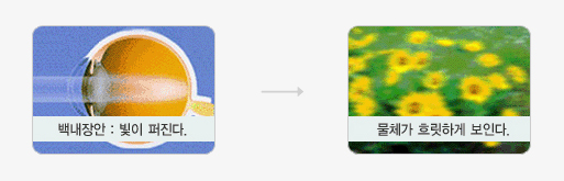 사진기의 렌즈에 해당하는 것이 우리눈의 수정체입니다. 사진기의 렌즈가 더러워지면 사진의 선명도가 떨어지게 되는 것과 마찬가지로 우리 눈의 수정체에도 혼탁(뿌옇게 흐려짐)이 생기면 눈속으로 빛이 잘 통과하지 못하므로 물체가 흐려지게 되고 시력이 떨어지는 것입니다. 이러한 여러 원인에 의해 눈 속의 수정체에 혼탁이 오는것을 백내장이라 합니다. 백내장은 나이가 들면 자연스레 생기는 질환이며 적절한 치료나 수술을 받으면 좋아지는 질환입니다.