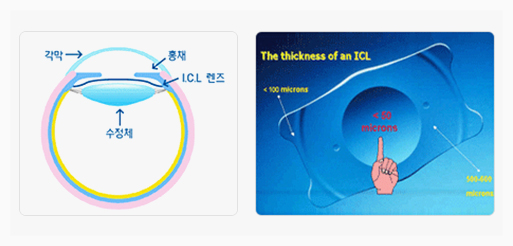 ICL은 안내 렌즈 삽입술(Implantable Contact Lens)의 약자로 환자의 굴절 이상에 맞는 특수 제작된 렌즈를 눈 속에 갈색을 띤 홍채 뒤와 눈의 렌즈인 수정체 앞 사이의 후방라는 공간에 수술로 넣어 영구적으로 위치시켜 시력을 교정하는 렌즈입니다.